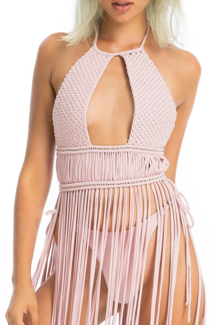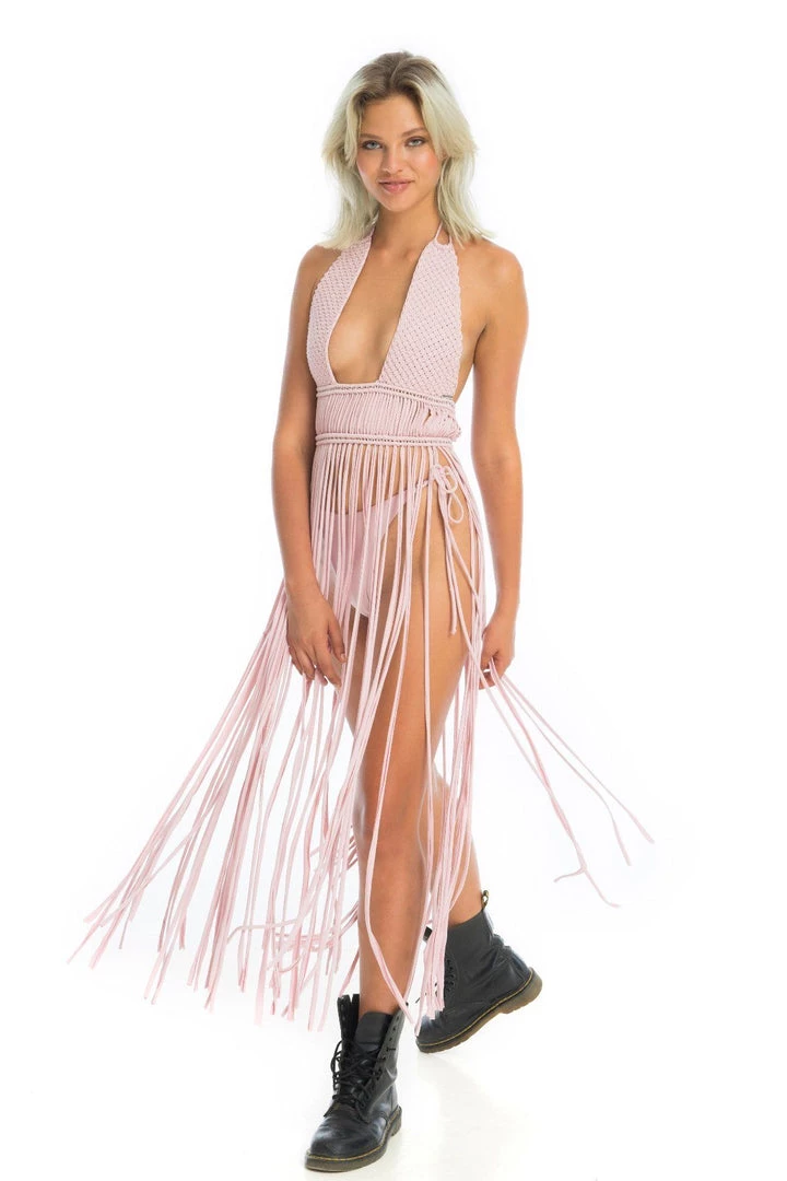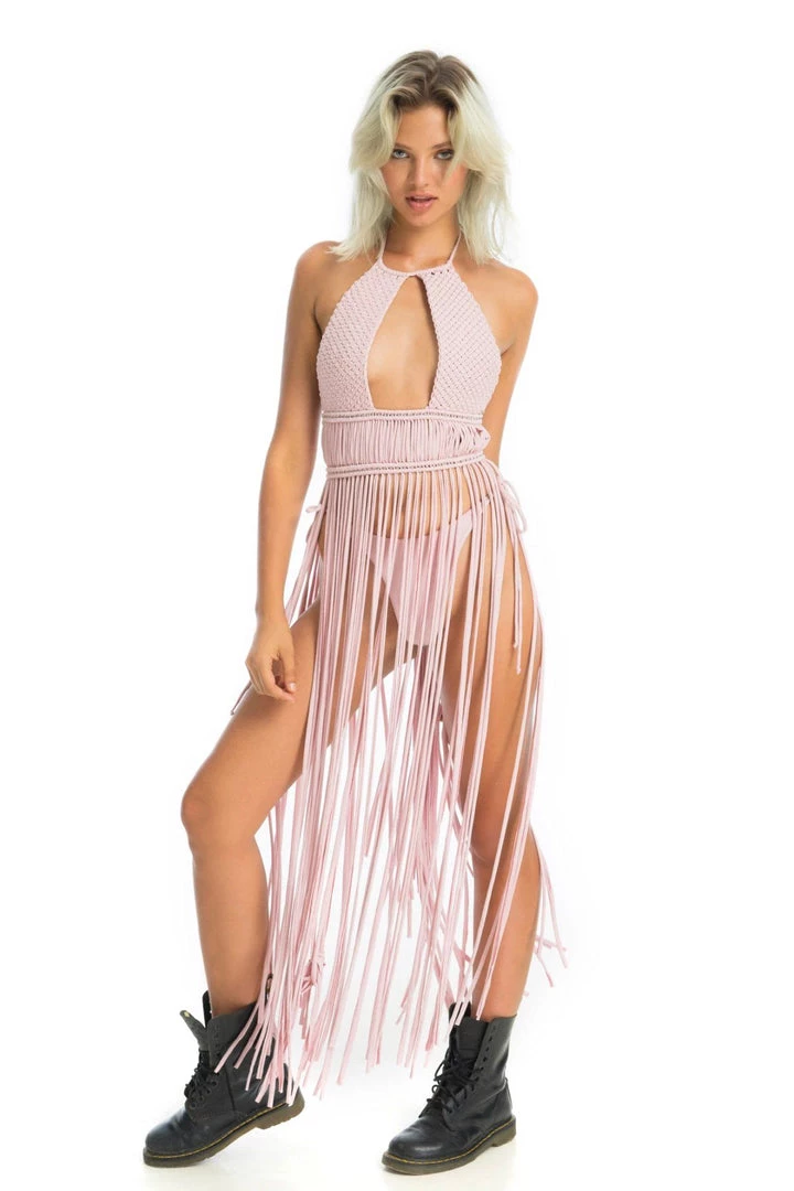 Feel like a delicate azalea flower in our graceful yet flowy Azalea macrame fringe dress set. Sway and swoon at any music festival. Create your unique boho festival look: adjust the fringe length, switch up how you tie the top, criss-cross the bikini bottoms over your stomach or go for ease with a bow on the sides.