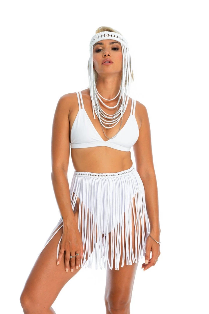 Dreamers mini skirt features a macrame waistband embellished with silver beads. Pair with the matching Dreamers top to flow from day to night with ease.