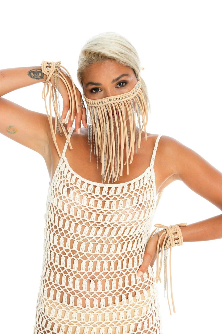 Worn with Mella crochet dress in Tan, also with Oracle Dawn epaulettes in Tan.Â