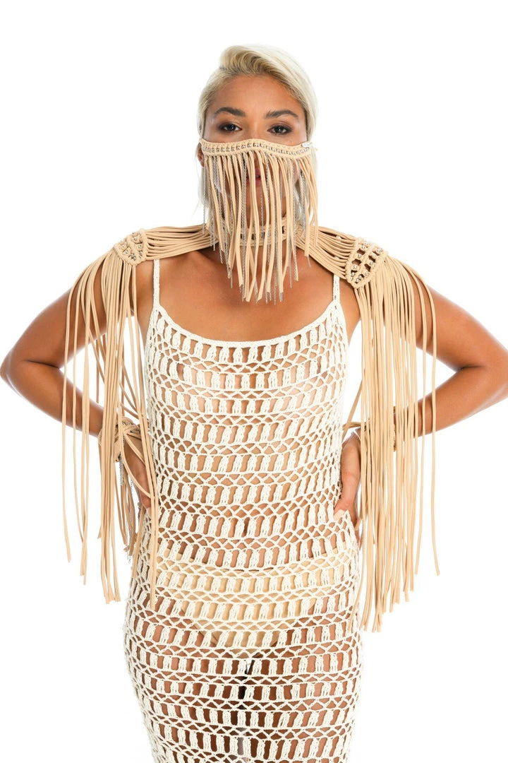 Worn with Mella crochet dress in Tan, also with Oracle Dawn epaulettes in Tan.
