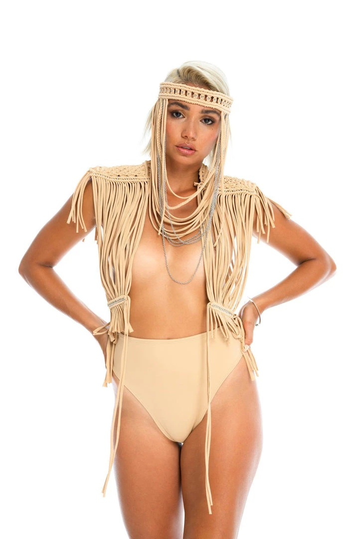 Styled with Dreamers mini skirt in Tan, also with Oracle Dawn headpiece in Tan.