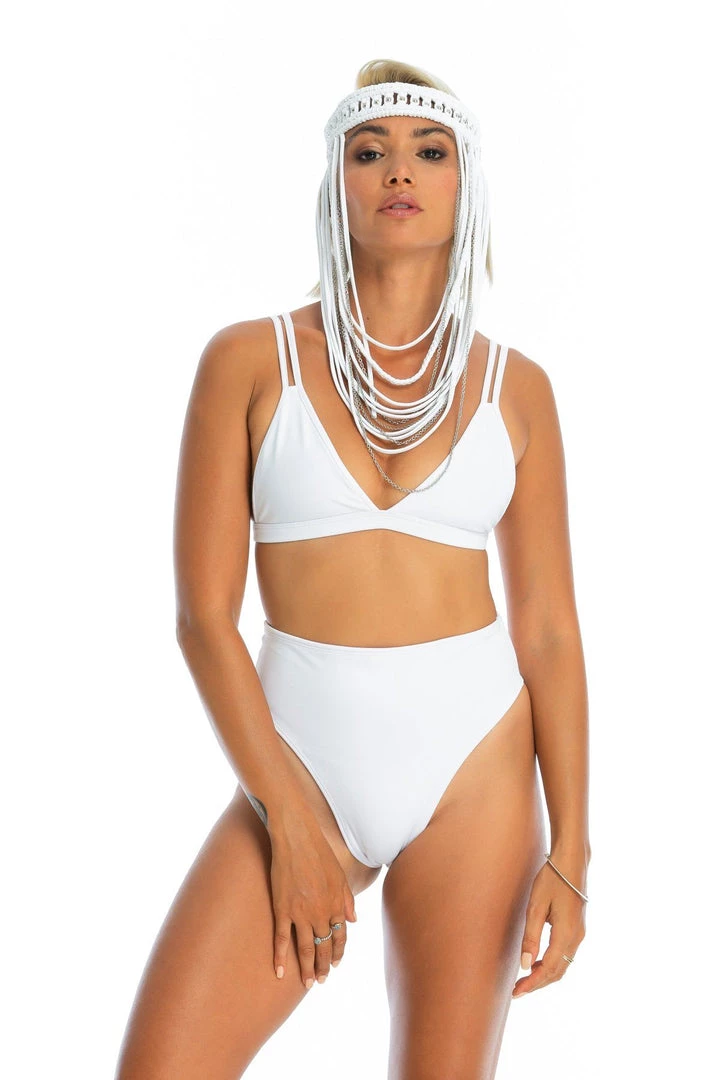 Worn with Ocean triangle top in White, also with Oracle Dawn headpiece in White.