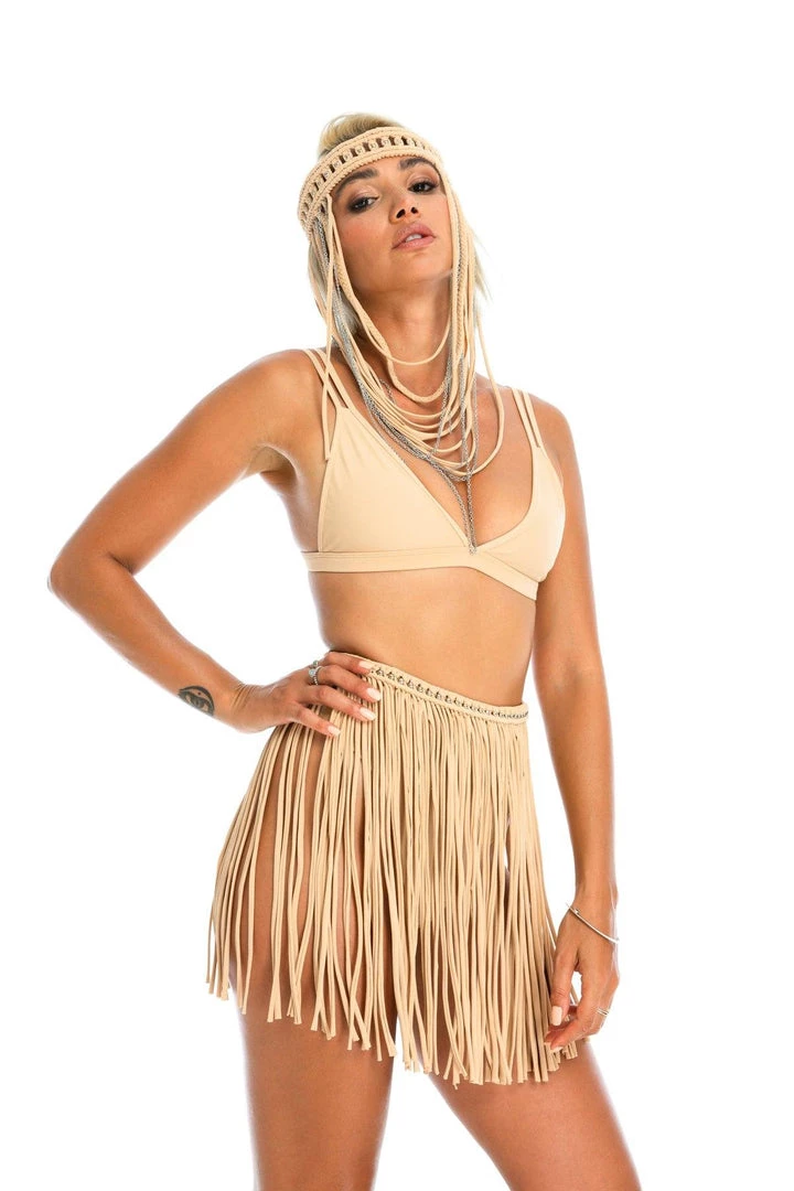 Worn with Ocean bottoms in Tan, also with Oracle Dawn headpiece in Tan, and Oracle Dawn cuffs in Tan.