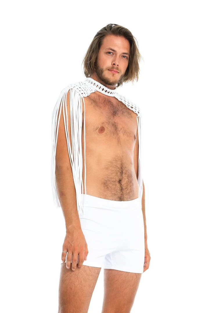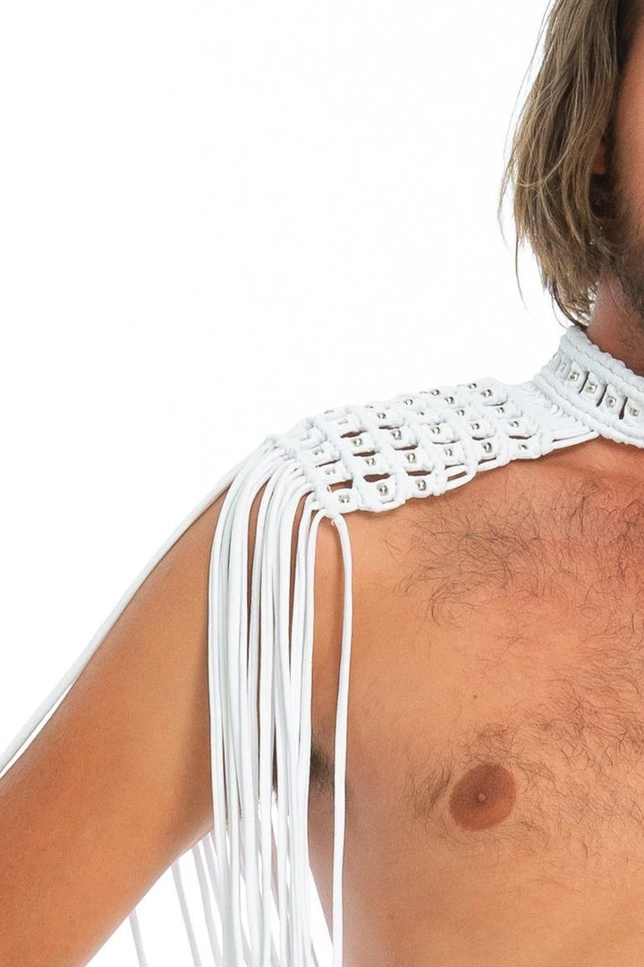 Sustainable hand-crafted epaulettes, embellished with silver beads. A stunning gender-neutral festival accessory.