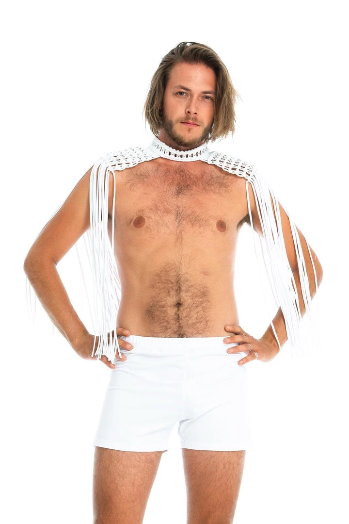 Sustainable hand-crafted epaulettes, embellished with silver beads. A stunning gender-neutral festival accessory.