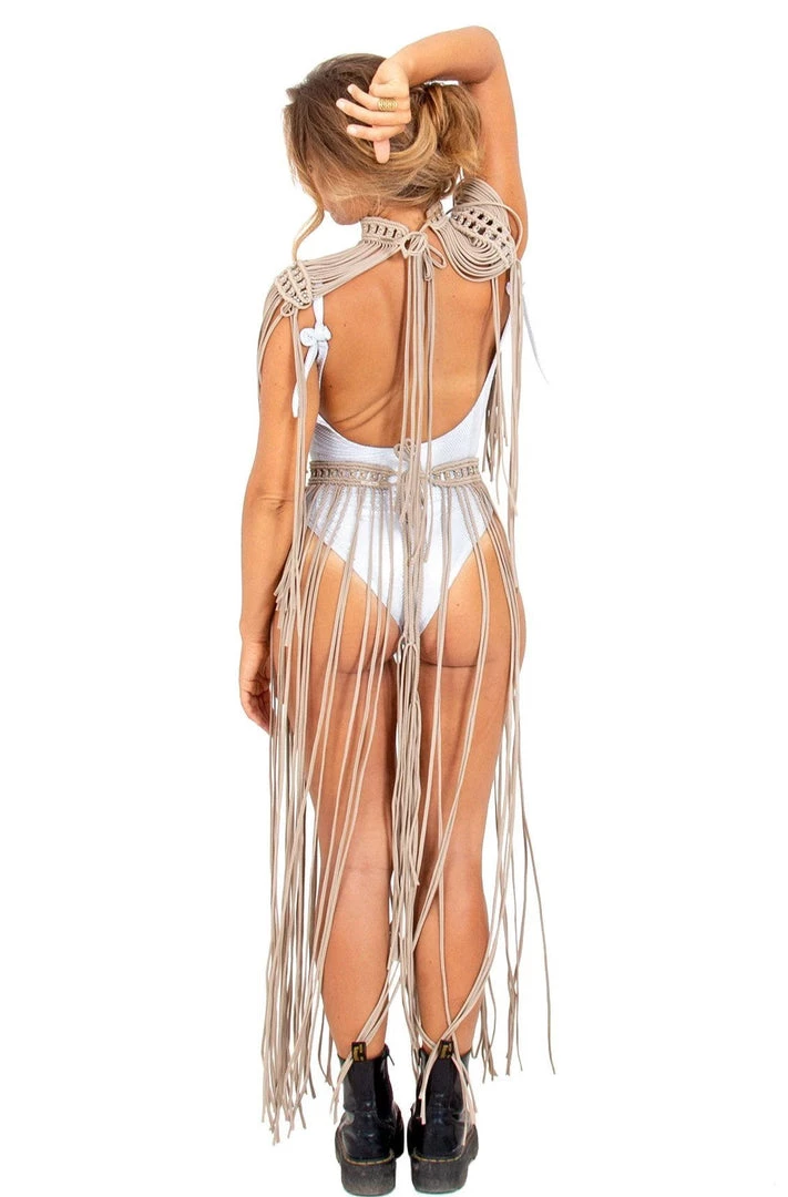 Start trippin’ and flippin’ over these Oracle Dawn sustainable festival epaulettes- shoulder top. Handmade macramé body jewellery. A top for babes who love to feel good!