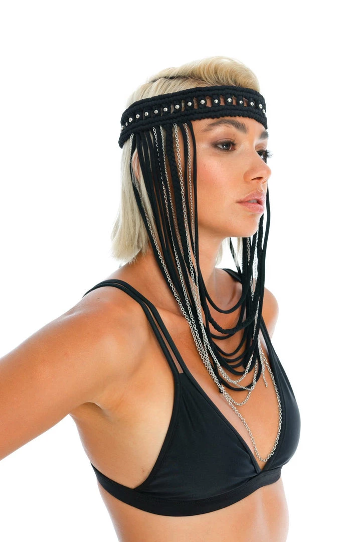 A dreamy goddess festival headpiece, embellished with silver beads and chain. This stunning headpiece comes with the added feel-good factor of being a Ladee Taha zero waste treasure.