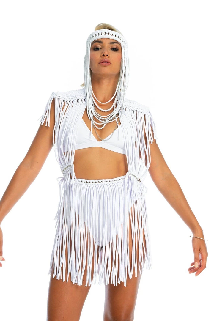 Worn with Dreamers mini skirt in White, also with Oracle Dawn headpiece in White.