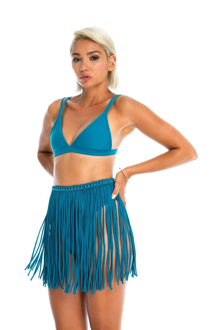 Worn with Ocean bottoms in Teal, also with Oracle Dawn headpiece in Teal, and Oracle Dawn cuffs in Teal.