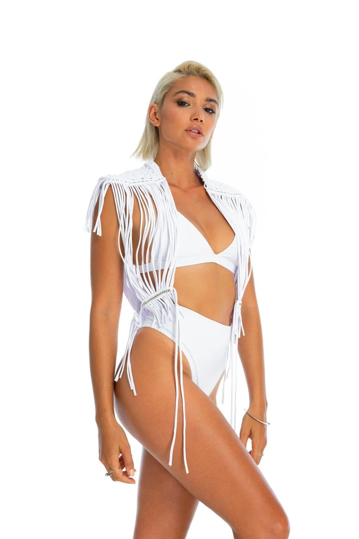 Worn with Ocean bottoms in White, also with Oracle Dawn headpiece in White, and Oracle Dawn cuffs in White.