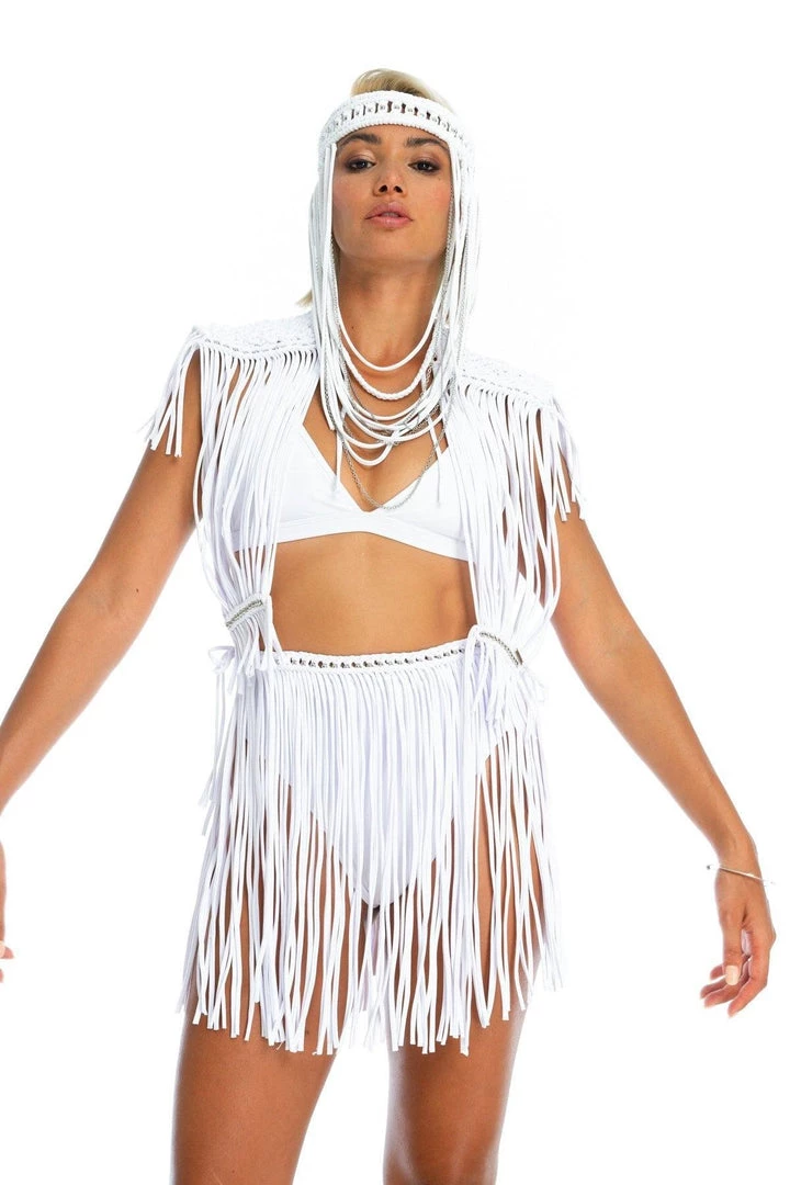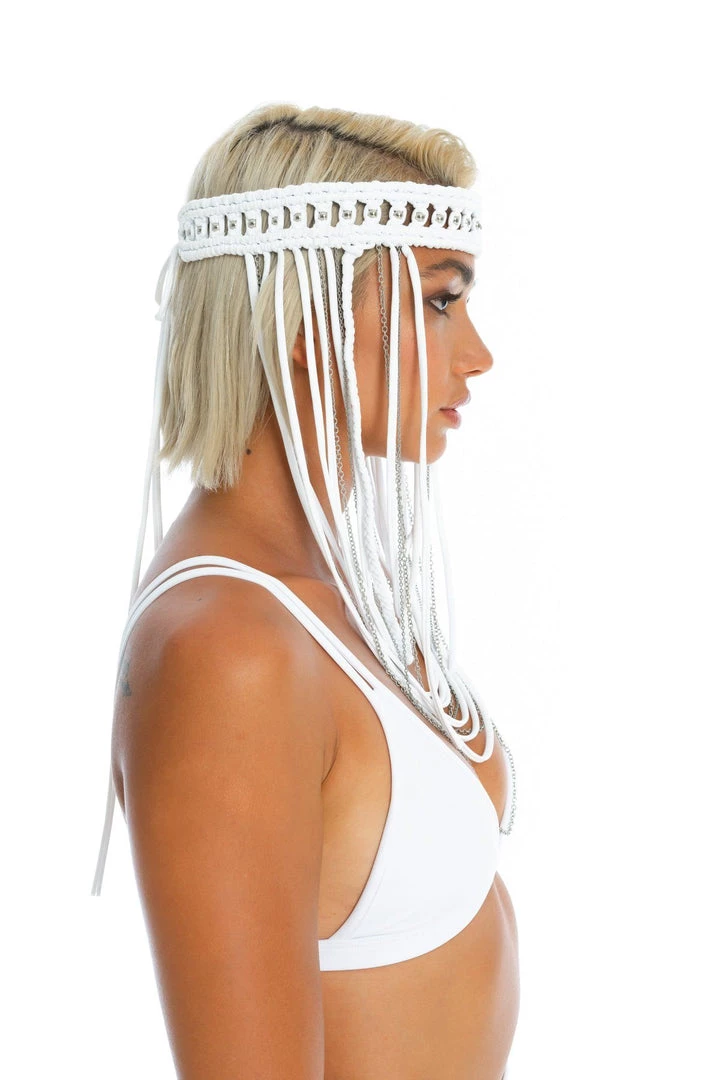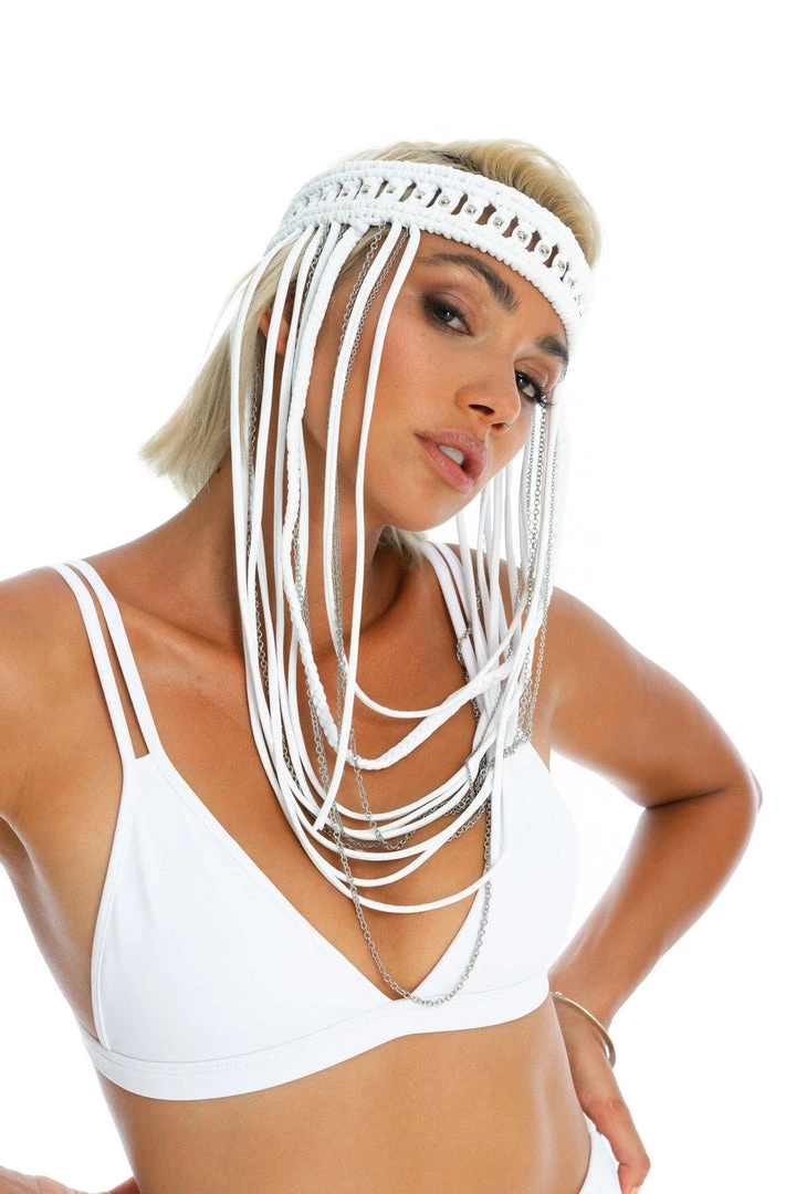 Worn with Ocean triangle bralette in White, also with Dreamers top in White and Dreamers mini skirt in White.