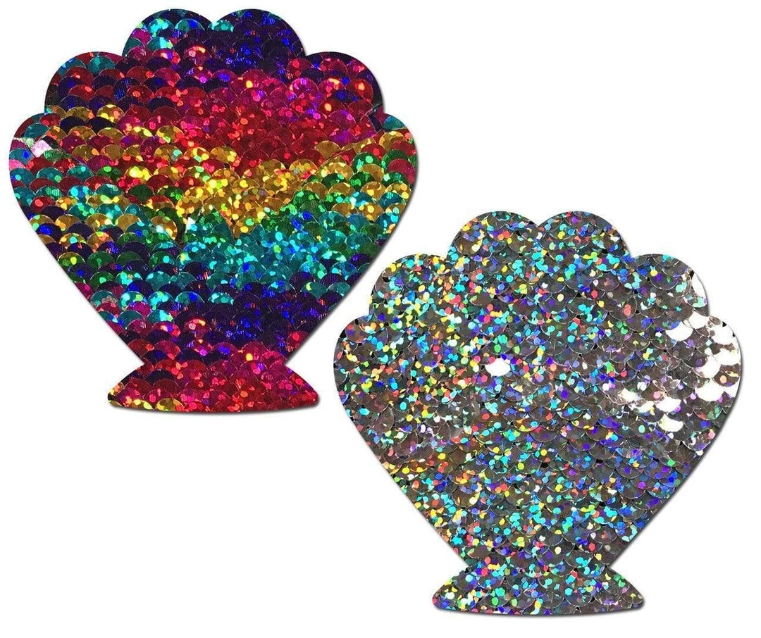 Rainbow And Silver Glitter Color Changing Sequin Seashell Nipple Pasties by Pastease® are hand-made in the USA of soft form-fitting glittery material that forms seamlessly to curves and resists wrinkling over hardening nipples.