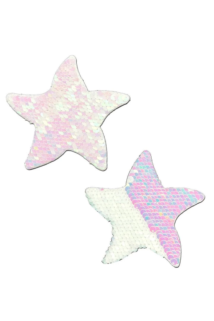 Iridescent Pink Pearl & White Flip Sequin Star Nipple Pasties by Pastease® are hand-made in the USA from two colour flip-sequin material that forms seamlessly to curves and resists wrinkling over hardening nipples.