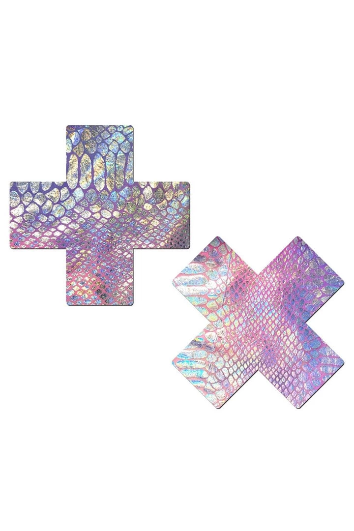 Reflective Rainbow Snake Skin Cross Nipple Pasties by Pastease® are hand-made in the USA of form-fitting material that forms seamlessly to curves and resists wrinkling over hardening nipples.