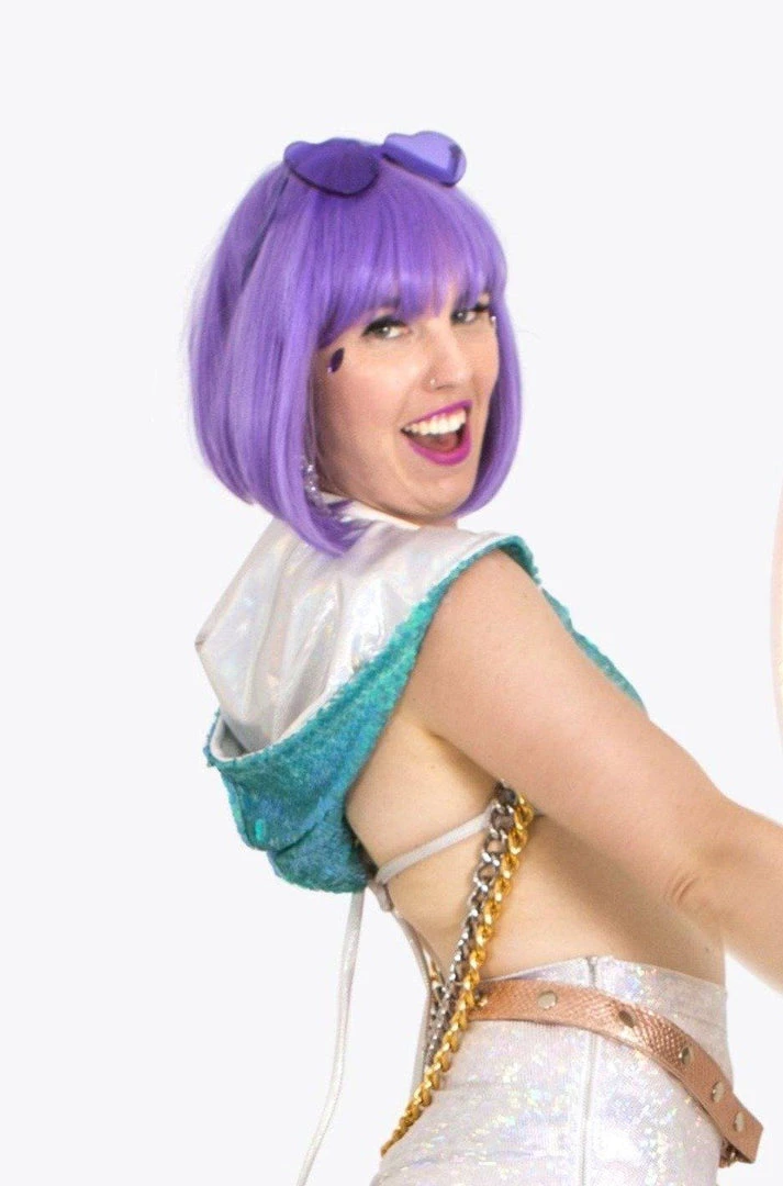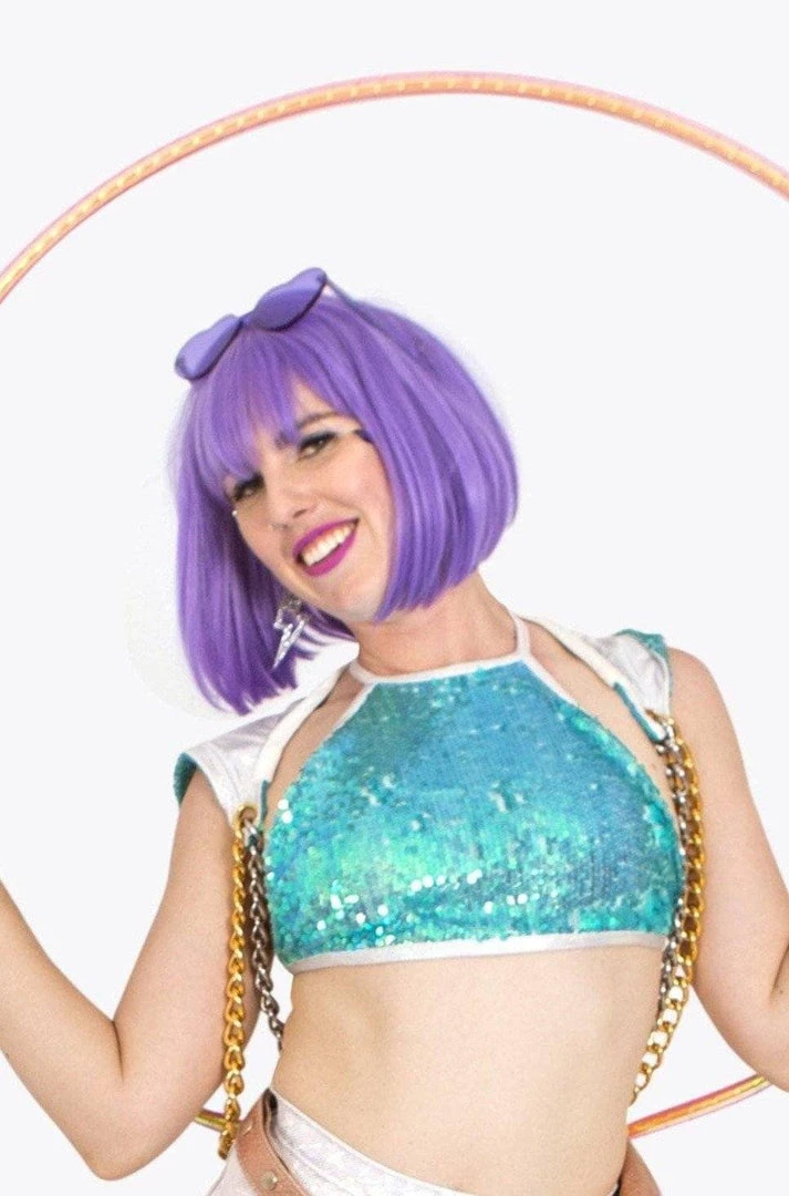 Pictured here in Mermaid Blue, with our Zip Side Hot Pants in Playa White with our Mermaid Sequin Halter Top, Sequin Hood & Rose Gold Bulan Belt.