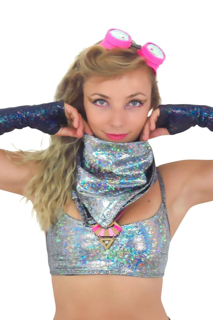 Pictured here with our Bralette in Disco Brawl with our Fingerless Gloves in Midnight Inferno and in Gold Rush.