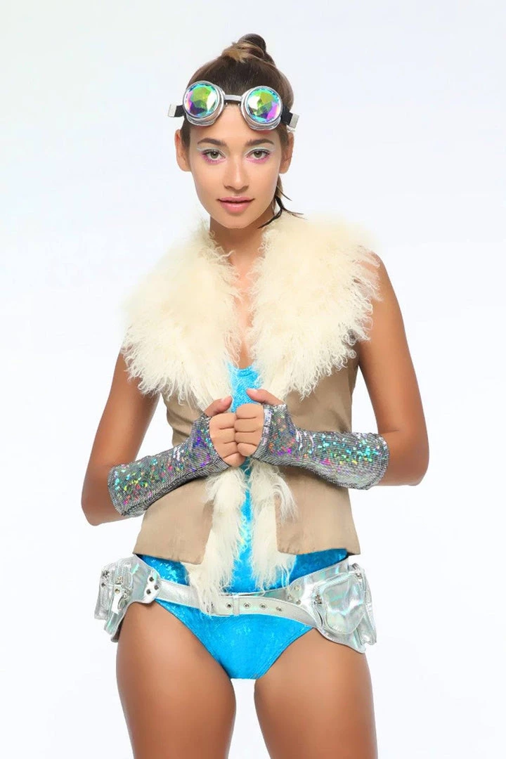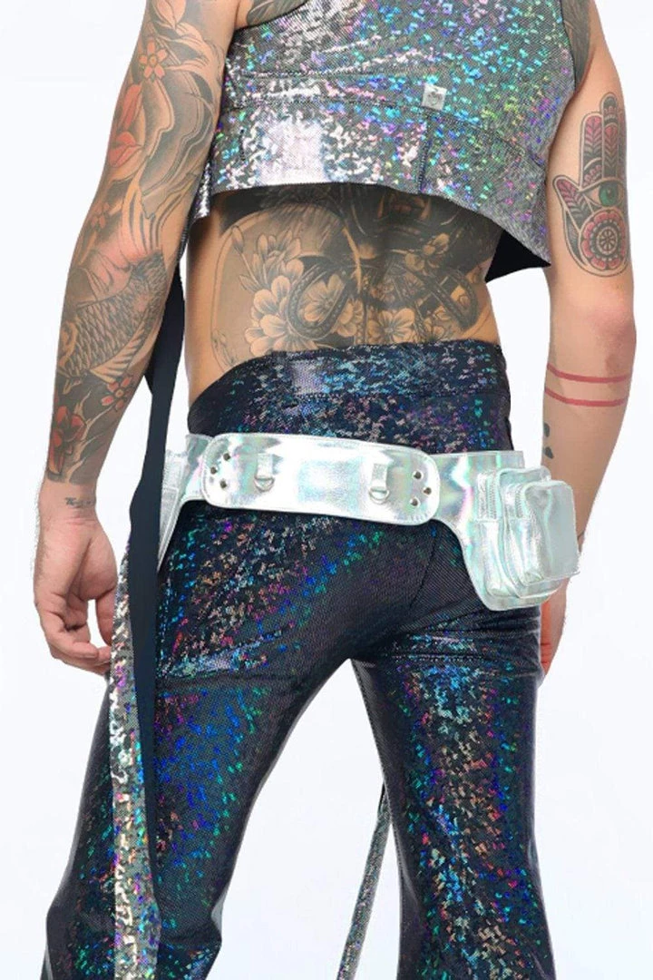 Pictured here in Silver Rainbow with our Mens Flares in Midnight Inferno & Wrap Top in Disco Brawl & our Halter Bodysuit in Galactic Glacier with Gloves in Disco Brawl.